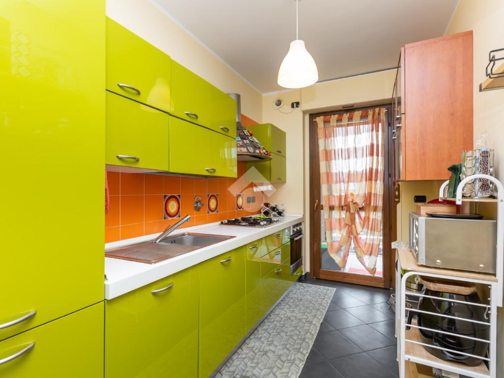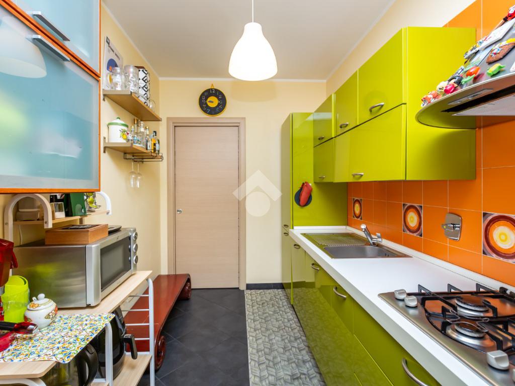 La cucina abitabile, separata dal soggiorno, ospita una parete cottura lineare ed è resa luminosa grazie alla presenza di una porta finestra che conduce al terrazzo con affaccio sull'interno cortile.